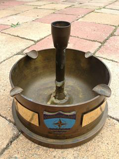 Veel marinemensen zullen dit kunstwerkje wel herkennen. Gemaakt van een granaathuls en in dit geval beslagen met herinneringsplaatjes en Engelse Pencemunten, is hier door een metaalbewerker, een mooie, grote, asbak gemaakt. Ik kan me niet herinneren dat het ding ooit echt is gebruikt in ons huishouden maar het heeft na aanschaf altijd wel ergens in de huis- of studeerkamer gestaan.